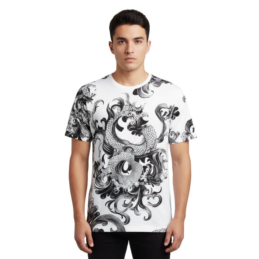 Next Print white shirt with a dragon on it is printed on the front